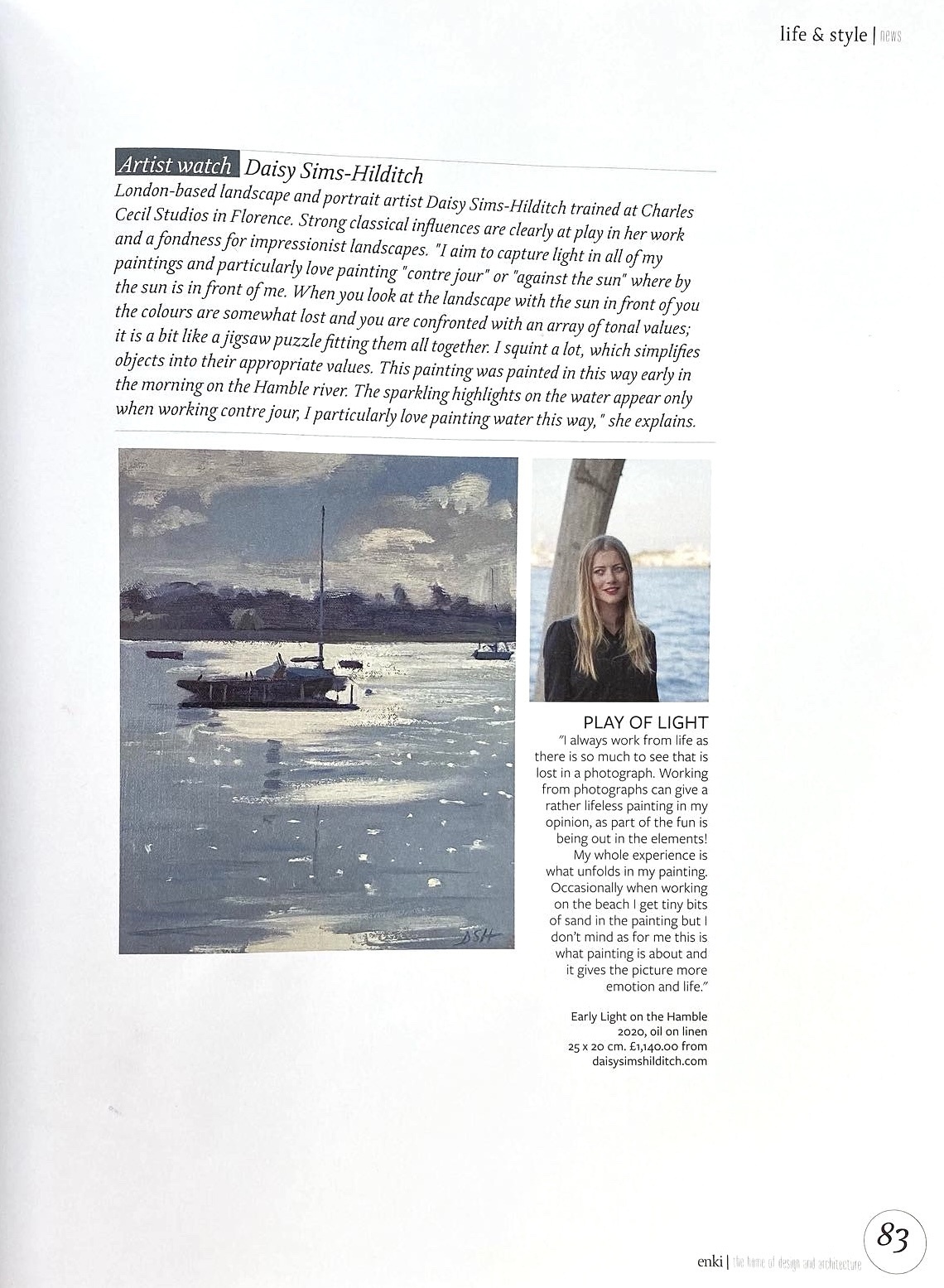 London-based landscape and portrait artist Daisy Sims-Hilditch trained at Charles Cecil Studios in Florence. Strong classical influences are clearly at play in her work and a fondness for impressionist landscapes. “I aim to capture light in all of my paintings and particularly love painting “contre jour” or “against the sun” where by the sun is in front of me. When you look at the landscape with the sun un front of you the colour as somewhat lost and you are confronted with an array of tonal values; it is a bit like a jigsaw puzzle fitting them all together. I squint a lot, which simplifies objects into their appropriate values. This painting was painted in this way early in the morning on the Hamble river. The sparkling highlights on the water appear only when working contre jour, I particularly love painting water this wary” she explains.